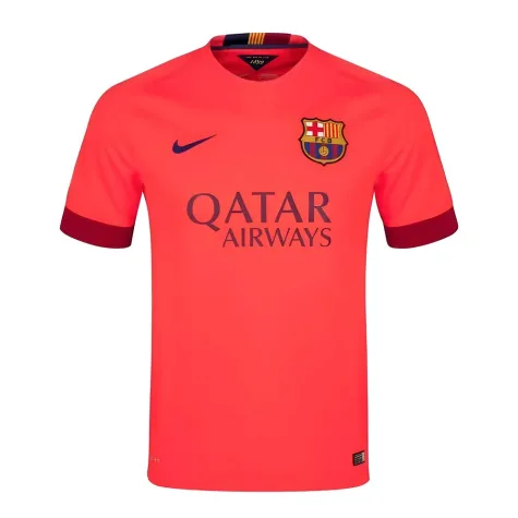 The Barcelona 2014-15 Away Shirt as worn by players such as Messi Neymar, Suarez, Iniesta and Xavi as the team finished 1st in La Liga, won the Copa del Rey and the Champions League.