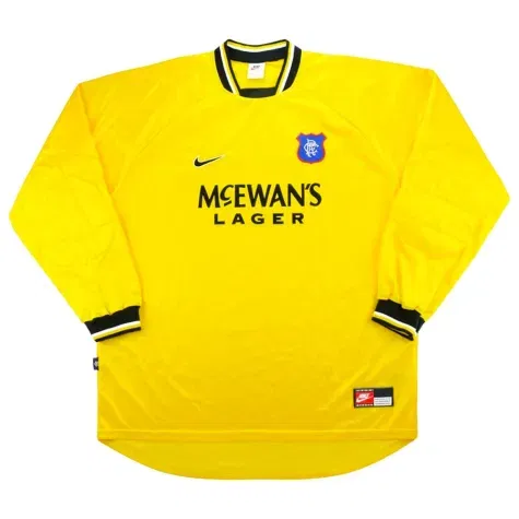 Good condition - Bobbling throughout, especially on the back of the right sleeve. Small hole on back of right sleeve. Overall in good condition.Rangers 1997-99 goalkeeper kit as worn by Klos and Goram as the team completed the domestic treble.