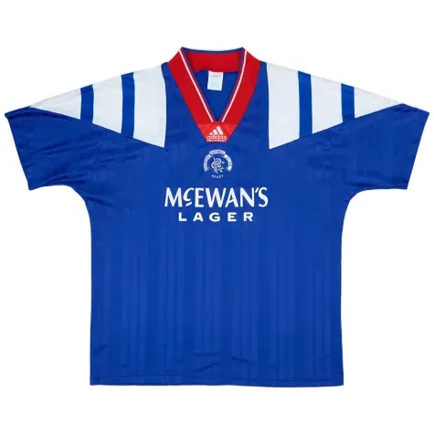 This Rangers 1992-94 Home shirt as worn by McCoist, Hateley, Durie, Gough and Mikhailichenko as the team completed the treble, beating Aberdeen in both cup finals.