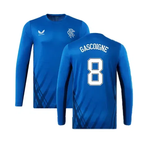 Official Paul Gascoigne football shirt. This is the NEW Rangers Long Sleeve Training Tee (Blue) for the 2022-2023 season which is manufactured by Castore and is available in all Adult sizes.