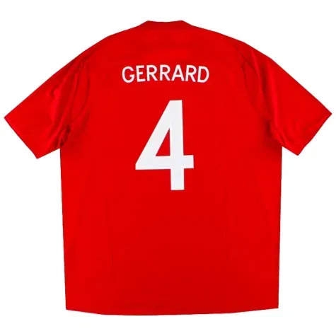 The England 2010-11 Away Shirt with Gerrard #4 name set as worn by players such as Rooney, Gerrard, Lampard, Cole and Crouch as the team reached the Round of 16 at the 2010 World Cup.