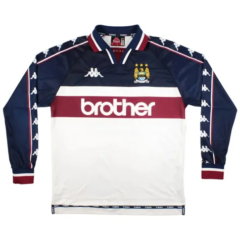 The Manchester City 1997-99 Away Long Sleeve Shirt was worn by players such as Brightwell, Wiekens, Brannan, Kinkladze and Rosler as the team finished 22nd and were relegated from the Premier League.