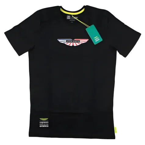 The Aston Martin F1 USA Tee Mens is a black t-shirt designed for men. It features the iconic wing logo of Aston Martin in the centre of the shirt. The wings are in white and the American flag colours are inside the wings as stripes giving the t-shirt a unique and stylish design. The stripes are in red, white, and blue colours, creating a patriotic feel for American fans of the sport. The t-shirt is made of high-quality materials like cotton, which makes it comfortable to wear. It is perfect for fans of Aston Martin and Formula 1 who want to showcase their support for the team and their love for American racing.