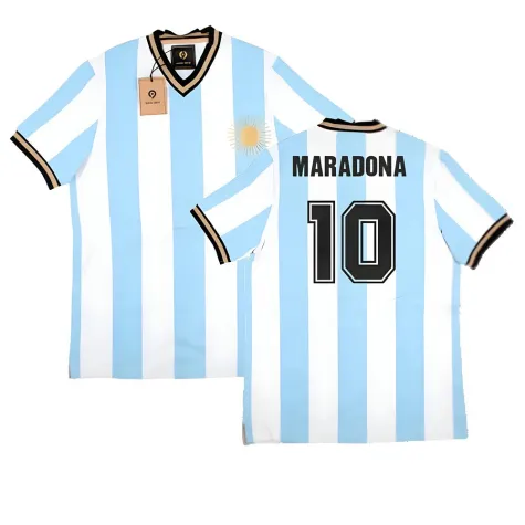 Official Diego Maradona football shirt. This is the NEW False Nein Argentina Home Vintage Shirt which is available in all Adult sizes.