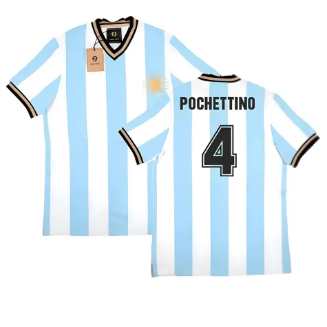 Official Mauricio Pochettino football shirt. This is the NEW False Nein Argentina Home Vintage Shirt which is available in all Adult sizes.