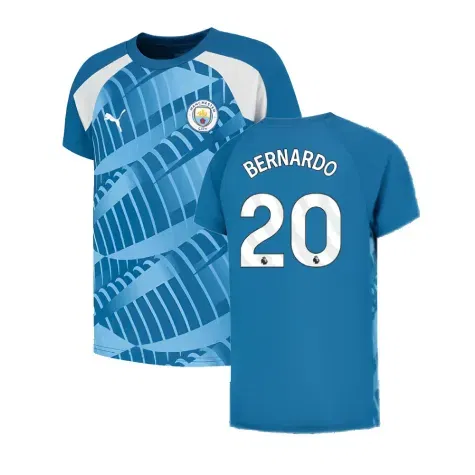 Official Bernardo Silva football shirt. This is the NEW  Man City Pre-Match Jersey (Lake Blue) for the 2023-2024 season which is manufactured by Puma and is available in all Adult sizes.