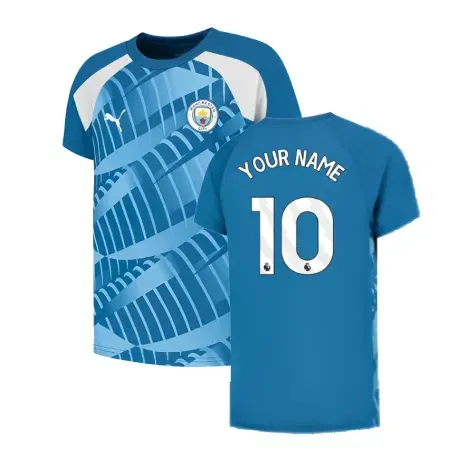 Official Your Name football shirt. This is the NEW  Man City Pre-Match Jersey (Lake Blue) for the 2023-2024 season which is manufactured by Puma and is available in all Adult sizes.
