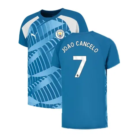 Official Joo Cancelo football shirt. This is the NEW Man City Pre-Match Jersey (Lake Blue) - Kids for the 2023-2024 season which is manufactured by Puma and is available in all Childrens sizes.