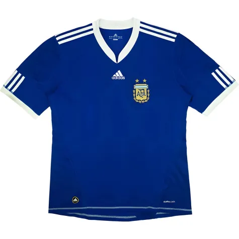 This Argentina 2010-11 Away shirt as worn when Argentina were competing in the 2010 World Cup, being knocked out in the quarter finals of the competition after losing 4-0 against Germany. This shirt was worn by the likes of Heinze, Di Maria, Maxi, Messi, Tevez