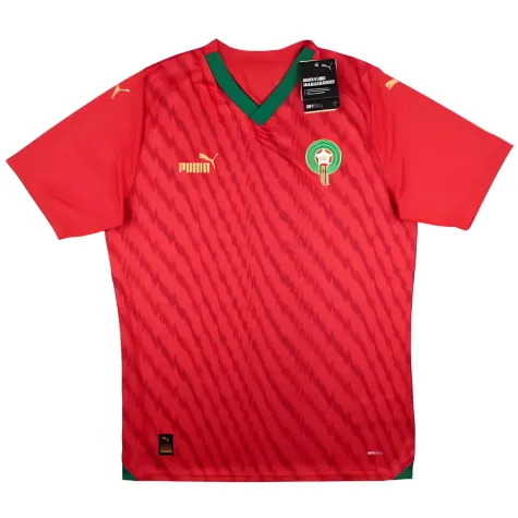 The Moroccan WWC Home Shirt for 2023-2024 is primarily red in color. The shirt features a simple yet elegant design with minimalistic detailing. The shirt has a red base colour, with the Moroccan Football Association's crest prominently displayed on the left chest in white. The shirt also features a puma logo on each of the sleeves. The shirt has a slim fit and is made from lightweight and breathable fabric, which is designed to keep the players cool and comfortable on the pitch. Overall, the Moroccan WWC Home Shirt for 2023-2024 is a stylish and understated design that is sure to appeal to fans and players alike.