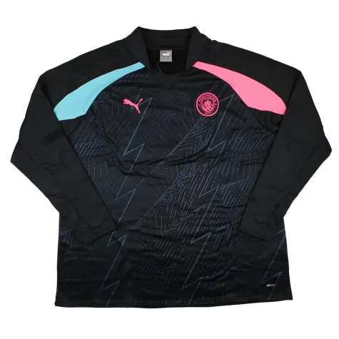 Prominently displayed on the sweat top are the Manchester City badge and the Puma logo, both in pink colour. The pink accents provide a vibrant contrast against the dark navy background, adding a touch of liveliness and flair to the design.