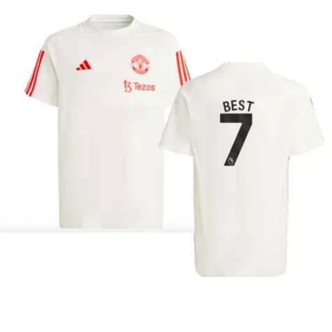 Official George Best football shirt. This is the NEW Man Utd Training Tee (White) - Kids for the 2023-2024 season which is manufactured by Adidas and is available in all Childrens sizes.