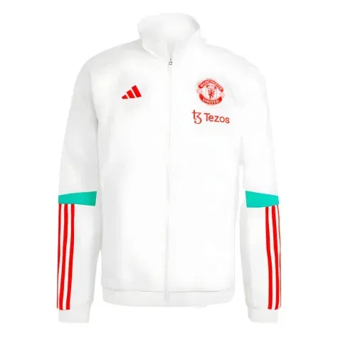 Manchester United players are rarely out of the public eye. To help them look as much a team off the pitch as they do on it, they wear adidas football jackets like this one. Its smooth woven fabric will ensure you stay comfortable. That club badge on the chest shows you belong. Made with a series of recycled materials, and at least 70% recycled content.