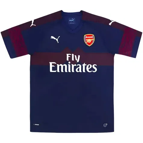 The Arsenal 2018-19 Away Shirt as worn by Aubameyang, Lacazette, Ozil, Ramsey, Xhaka and Mkhitaryan as the team finished 5th in the Premier League and reached the Europa League Final.