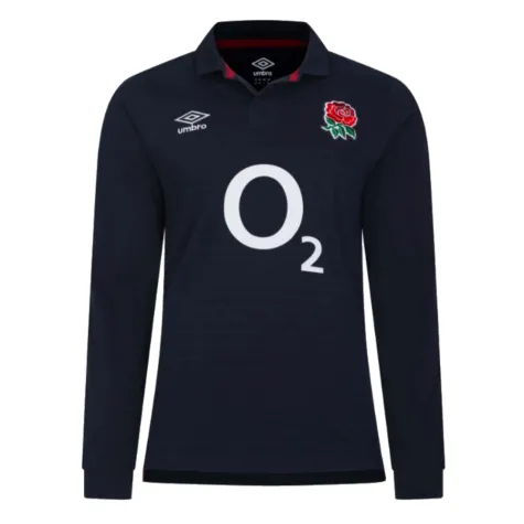 The Umbro England 2023-2024 Mens Alternate Classic Long Sleeve Shirt offers rugby fans a classic shirt with England details to show your support. Made with a classic collar design that has reinforced seams, and twin needle stitching complete the classic look. Long Sleeves with cuffs at wrists. Detailed with a St. Georges back neck sign off, forward side seam, embroidered stacked diamond and embroidered country crest to the front of the jersey. Woven official licensed label applied.