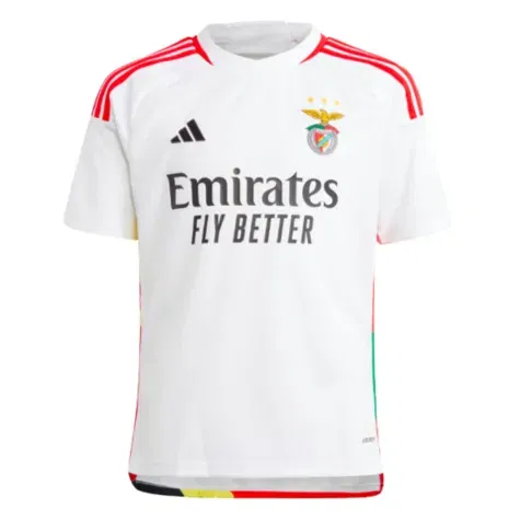 Benfica bring joy to fans all around the world. Standing out from this crisp white adidas 2023-2024 third jersey, multicoloured details represent the Lisbon club's diversity and international appeal. Created to be worn on the pitch and in the stands, this juniors' version will keep you comfortable and proud thanks to its moisture-wicking AEROREADY and silicone badge. A "120 Anos" signoff celebrates a major football milestone. Made with 100% recycled materials.