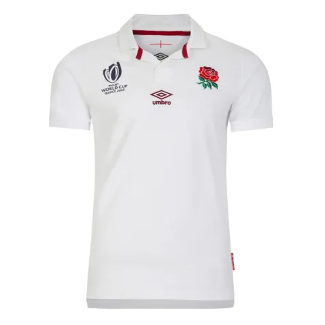 The short-sleeved shirt features a twill fixed placket and fold over collar and a dropped back hem. The upper chest of the shirt proudly shows off the England Rugby logo over the heart alongside the Umbro and Rugby World Cup logos.