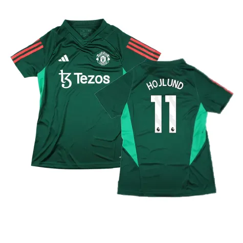 Official Rasmus Hojlund football shirt. This is the NEW Man Utd Training Shirt (Green) - Ladies for the 2023-2024 season which is manufactured by Adidas and is available in all Adult sizes.