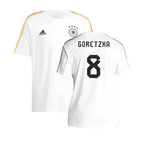 Official Leon Goretzka football shirt. This is the NEW Germany 3S DNA Tee (White) for the 2024-2025 season which is manufactured by Adidas and is available in all Adult sizes.