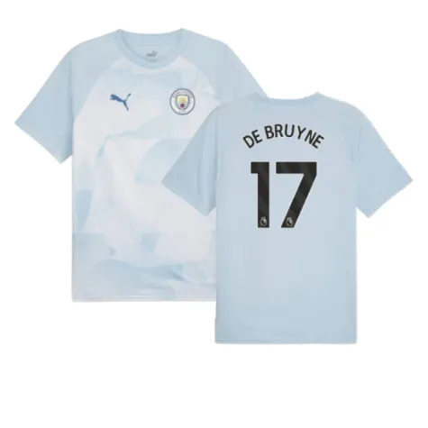 Official Kevin De Bruyne football shirt. This is the NEW Man City Prematch SS Jersey (Silver Sky) for the 2023-2024 season which is manufactured by Puma and is available in all Adult sizes.