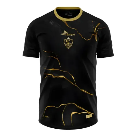 Elevate your game with the Zamalek SC Third Player Edition Jersey. This high-performance jersey, styled in a sophisticated black with gold accents, mirrors the exact specifications worn by the players.