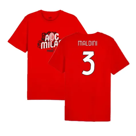 Official Paolo Maldini football shirt. This is the NEW AC Milan ftblCulture Tee (Red) for the 2024-2025 season which is manufactured by Puma and is available in all Adult sizes.