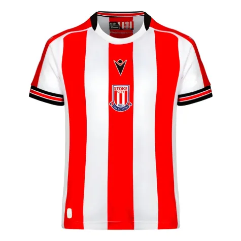 The Macron Stoke City 2024-2025 home kids shirt has the club's famous white and red stripes combined with black for logos. All logos are in the center. Within the stripes is a subtly patterned bottle kiln sublimation in recognition of the citys pottery industry. The club's new icon, inspired by the kiln, is on the back under the collar.