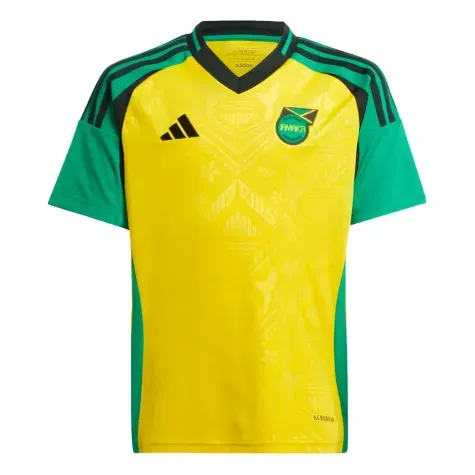 Inspired by Jamaica's vibrant culture, an embossed all-over graphic catches the eye on this juniors' adidas football jersey. Incorporating the country's national flower and bird, the design is accompanied by an embroidered badge on the front and the team's nickname on the back. AEROREADY deals with moisture to keep young fans comfortable while they represent.This product is made with 100% recycled materials.