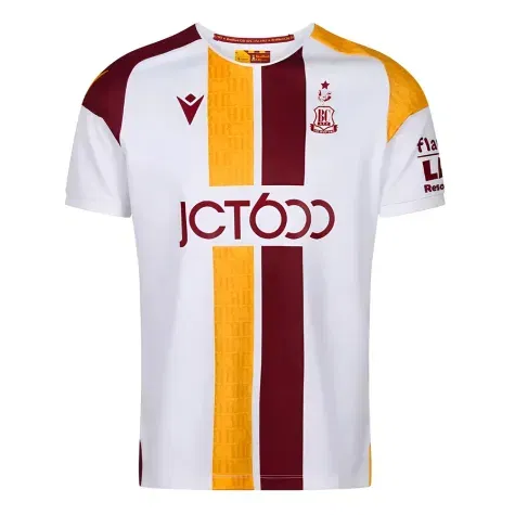 Inspired by the 1970s, the kit features a white shirt with claret and amber stripes and shoulders, main club partners JCT600 and University of Bradford on the front and back, Macron and Flamingo Land logos, 'UK City of Culture' on playing shirts, white shorts with tonal crests and 'BC' wordmarks, and white socks with claret and amber trim and 'BCAFC' wordmarks.