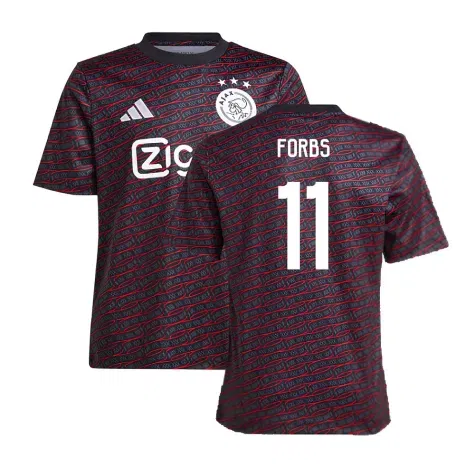 Official Carlos Forbs football shirt. This is the NEW Ajax Pre Match Shirt (Black) - Kids for the 2024-2025 season which is manufactured by Adidas and is available in all Childrens sizes.