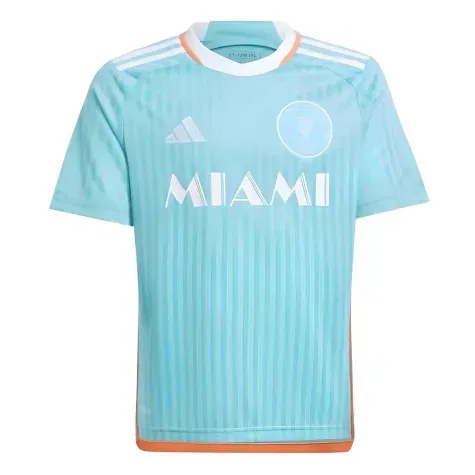 Standing out with a squeeze of Miami sporting heritage. This juniors' Inter Miami CF third jersey from adidas incorporates classic details and flashes bright orange hues that salute the iconic Orange Bowl. AEROREADY keeps young soccer fans dry while they shout for their team. Starring on the smooth fabric, an art deco-style team name has the final word. This product is made with 100% recycled materials.