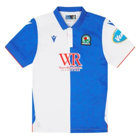 The Macron Blackburn 2024-2025 kids home jersey draws inspiration from the Premier League-winning 1994-95 home kit: It has the club's famous blue and white half-and-half design with a collar similar to the 1994-95 season (red lip near the buttons). A rose is embossed into the blue part of the shirt.