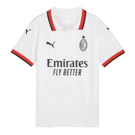 Details make all the difference in the 2024-2025 AC Milan Away Kit. The classic white away combined with a red-and-black polo collar and monochromatic crest personifies the spirit of success and casual sophistication of a team synonymous with the Beautiful Game. Tonal pinstripe pattern adds a historic touch, honoring AC Milans origins as the Milan Football Club.