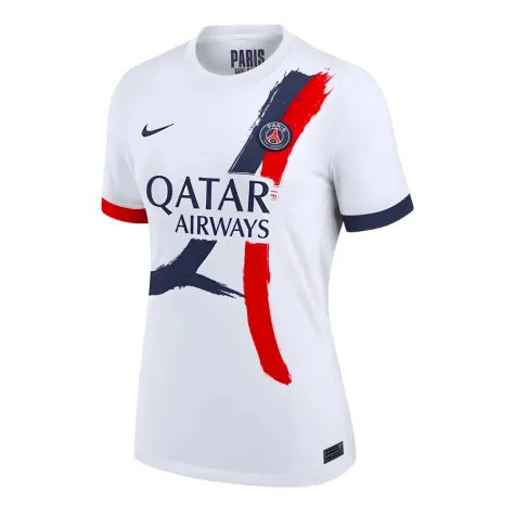 The 2024-2025 Womens Away kit pays homage to an iconic Club shirt worn by Parisians during the 1990-91 and 1991-92 seasons, while also embodying the innovative spirit of the club's new generation. Featuring two red and blue stripes on a white background, the shirt takes inspiration from the iconic silhouette of the Eiffel Tower. The kit will be worn by all Paris Saint-Germain teams, including both the men's and womens professional teams, as well as its academy teams.