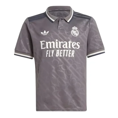Elegance is their identity. The embossed "RMCF" monograms repeating across this juniors' Real Madrid third jersey borrow their distinctive look from the lettering used on traditional Madrid street signs. Standing out from the classy design, the iconic Trefoil returns to an adidas match shirt after a long break. Behind it all, AEROREADY keeps football fans dry and comfortable as they shout their support. This product is made with 100% recycled materials.