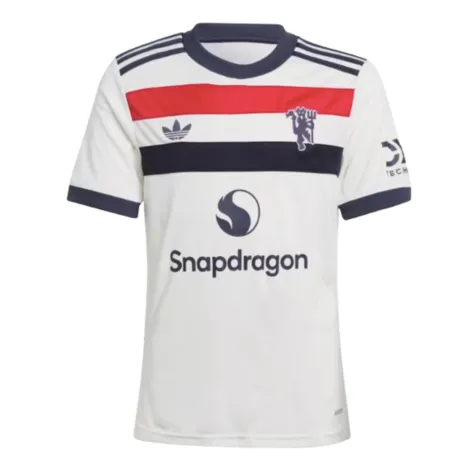 Football pride never falls out of fashion. This juniors' Manchester United third jersey salutes the flags that follow the club home and away, while also adding some classic adidas heritage. Shorthand for sporty style, a Trefoil and red devil badge stand out from that tricolour chest bar. Moisture-managing AEROREADY keeps fans comfortable. This product is made with 100% recycled materials.