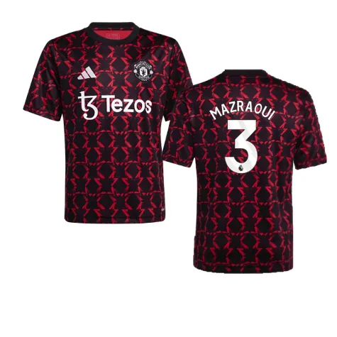 Official Noussair Mazraoui football shirt. This is the NEW Man Utd Pre-Match Shirt (Black) - Kids for the 2024-2025 season which is manufactured by Adidas and is available in all Childrens sizes.