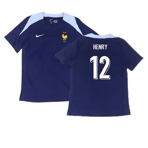 Official Thierry Henry football shirt. This is the NEW France Dri-Fit Strike Training Shirt (Navy) for the 2024-2025 season which is manufactured by Nike and is available in all Adult sizes.