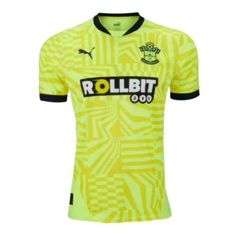 Stand out with the Southampton FC 2024-2025 Away Kit, featuring a striking dazzle graphic on the front of the shirt and sleeves in fizzy yellow and yellow sizzle. The navy collar, cuffs, and shorts create a recognizable and classic colour combination for the Saints.