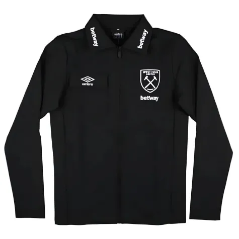 The West Ham 2024-2025 Umbro Presentation Football Jacket in Black combines style and functionality, perfect for fans and players alike. This sleek jacket features a full-zip design with a high collar for added warmth and comfort. The West Ham club crest is proudly displayed on the chest alongside the classic Umbro logo, both embroidered for a premium finish. Made from lightweight, breathable material, the jacket is ideal for layering during training sessions or wearing casually. Elasticated cuffs and hem ensure a snug fit, while zippered side pockets offer secure storage for essentials.