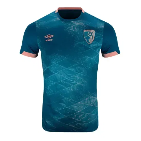 This season's AFC Bournemouth third kit shirt draws it's inspiration from our seaside roots - finished in deep lagoon green with an aquatic themed design on the front featuring subtle seashells and waves. Accented with peach trim on the arms, neckline, club crest and Umbro logo, and a seashell inspired AFCB print on the rear of the neck.