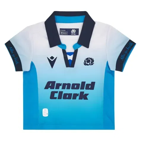 2024/25 baby away replica shirt - white and blue baby shirt with navy collar, and cuffs sublimated with 'alba gu brth'; the Scotland crest is embroidered over the heart in navy and claymores are sublimated on the rear.