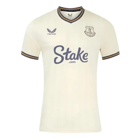 Show your support for the Toffees with this men's Everton FC 2024-2025 Third Shirt from Castore. In an off white colourway with contrasting trims, this classic shirt is built from smooth, breathable polyester fabric, with sweat-wicking properties for cool comfort. It features ribbed detailing to the contrasting V-neckline and short sleeves. Finished off with the Castore logo and the famous Everton badge on the chest.