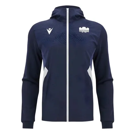 Edinburgh Rugby 2024-2025 warm up anthem jacket. Navy full zip hooded warm up jacket with tone on tone pattern over the torso and white details at the flanks.