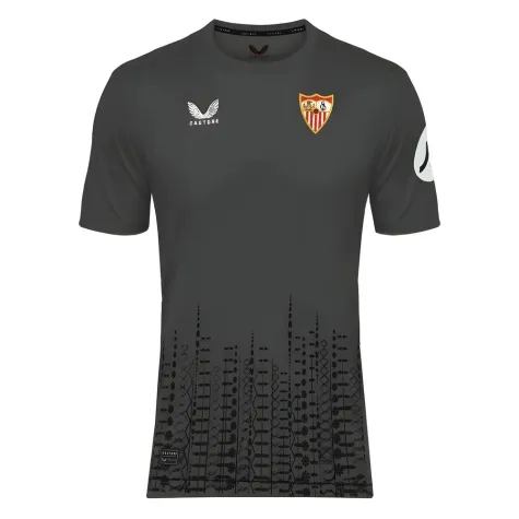 Short-sleeved and dark grey, with the technical sponsor's logo in white and the Sevilla Ftbol Club crest embroidered in full colour over the heart, this is the Official Sevilla FC Goalkeeper's Home Kit Shirt for the 2024-2025 season.