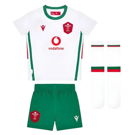 Even the youngest rugby fans can feel like Wales Rugby legends in the new Macron WRU alternate replica mini kit. Made from lightweight, polyester fabric for a comfortable fit, this kit comes with replica shirt, shorts and socks for the full on-pitch look. Replicating the pro shirt, the white shirt with green and red details on the collar and cuffs, red flanks and green stripe contouring the torso; a dragon is embossed on the rear panel and the Welsh Rugby crest is applied over the heart. The kit is completed with green shorts and white socks. The shirt has poppers at the shoulders for ease of getting on an off.