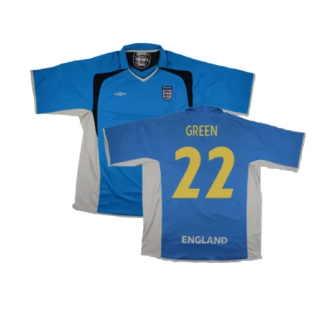 Good condition - Umbro GK shirt, blue grey trimmings.Shirt has a few stains to the front of it and the England writing on the back has started to slightly crack , nothing major on it. Shirts colours are great looking on the shirt. Overall, the shirt is in good condition.