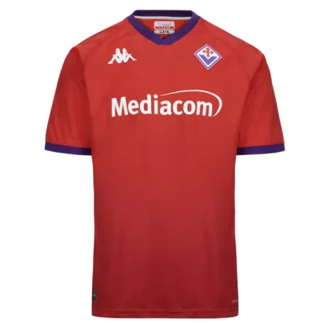 The Fiorentina 2024-2025 Kappa Third Shirt showcases KOMBAT 2025 technology for modern comfort and performance. Designed with HYDRO-WAY PROTECTION and crafted from recycled interlock fabric, this shirt keeps players cool and dry. It features a regular fit with a sleek V-neck jacquard rib collar, along with jacquard detailing on the front, back, and sleeves for added texture. The iconic Omini logos are heat-transferred onto the chest and sleeves, while the Fiorentina crest appears as a 3D silicone patch. Finishing touches include heat-transferred collar logos and back lettering, embodying ACF Fiorentina pride in every stitch.