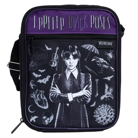Purple and black bag featuring Wednesday plus additional themed silhouettes, plus the text 'I Prefer Black Roses'