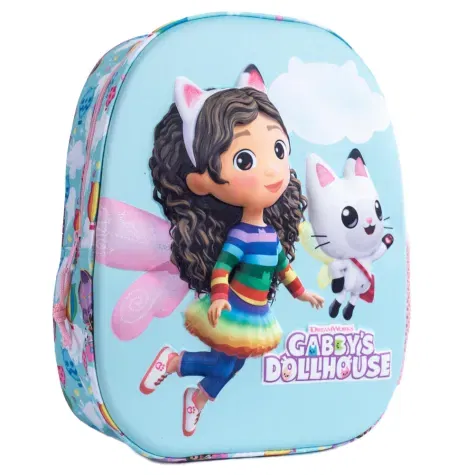 Vibrant pastel coloured 3D backpack featuring Gaby and Pandy Paws on the front with a repeat pattern on reverse